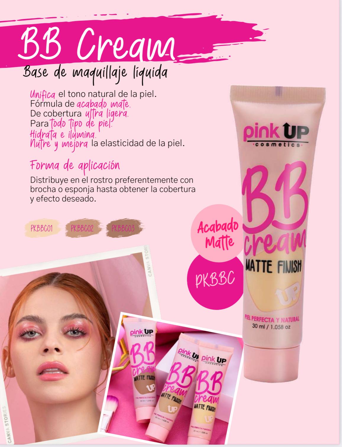 BB Cream es una base de cobertura ultraligera y de acabado humectante sin brillo. ¡Será como una segunda piel! ¿Una Base Ligera con acabado mate? ¡En Pink Up es posible! Perfecta para todo tipo de pieles, otorga un acabado natural, hidrata, nutre y mejora la elasticidad de la piel. Unifica el tono natural de la piel. Aplica sobre tu rostro con movimientos suaves para darle un acabado suave y unificado
